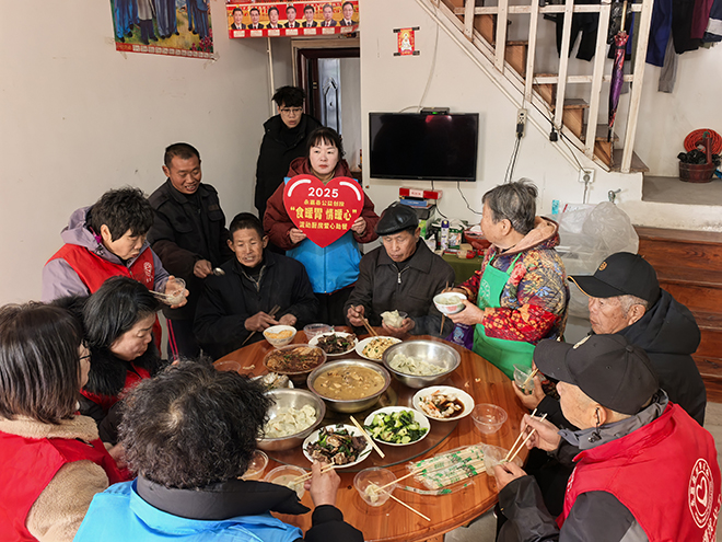 另一边,志愿者们用提前备好的馅料与面皮包饺子,厨房里,陈林妹的儿子主动添柴生火,与大家一同忙碌。今年的年夜饭格外丰盛,在志愿者的精心烹制下,软糯入味的猪蹄膀、鲜美的葱油黄鱼、滋补的本地鸡等一道道正宗永嘉楠溪江风味土菜陆续上桌,满是家乡的味道与浓浓的心意。