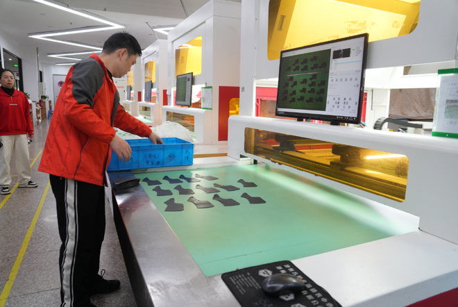 早上9时许,记者走进红蜻蜓生产车间看到,自动划线机、自动切割机、自动数码冲孔机等自动化设备正高速运转,在机器轰鸣声中,一道道工序紧密衔接,生产精度和效率直观可见。实际产量500,目标产量3000,达成率17%……在红蜻蜓男鞋裁断线数字屏幕上,生产关键信息转化为直观可辨的形式,让生产管理“一眼看透”,实现了"信息在线"与"管理在线",在提升效率的同时也降低了不良率,让问题无处隐藏、目标清晰可见。