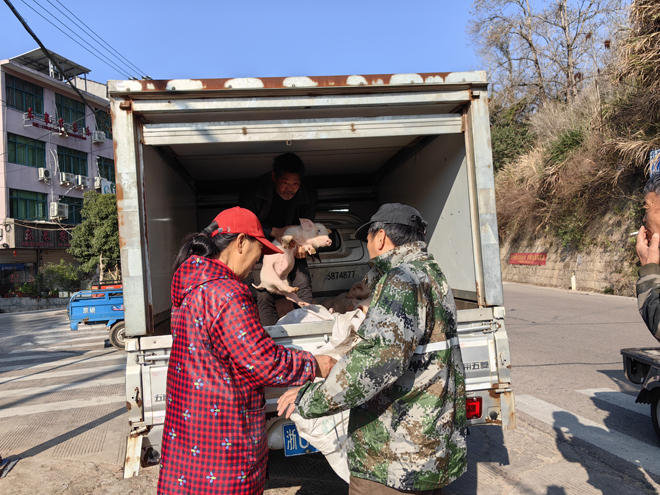 为提高运输效率,项目负责人和志愿者分上塘、鹤盛当地两路出发。鹤盛志愿者一早前往养殖场搬运猪仔装车,确保猪仔分发高效准时。
