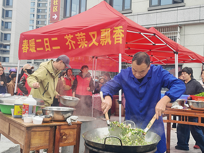在上塘,雨花斋义工队与中西村老年食堂两大阵地开展“爱心芥菜饭”活动,在120人次义工及业主志愿者的协同努力下,累计炒制并分发芥菜饭2247份,惠及社区居民、退伍老兵、高龄老人等群体;东城社工站义工队走进东城街道城东社区,开展“春暖二月二芥菜又飘香”主题活动,现场烹制并送出1500余碗芥菜饭,邻里欢聚氛围浓厚。