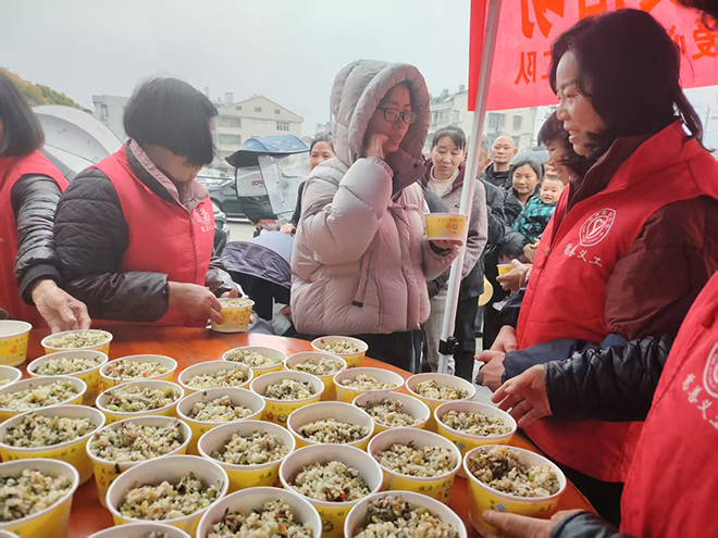 在瓯北街道,和一爱心茶亭义工队提前筹备食材,19日着手清洗配料、备齐食材,20日凌晨4点便开工炒制,准备了香稻米、两千多斤芥菜及十多种辅料,义务分发3800余碗芥菜饭,惠及环卫工人、腿脚不便的老人、残疾人、快递员及过往村民,放学的瓯北第五小学学生也排队品尝这份春日鲜味。