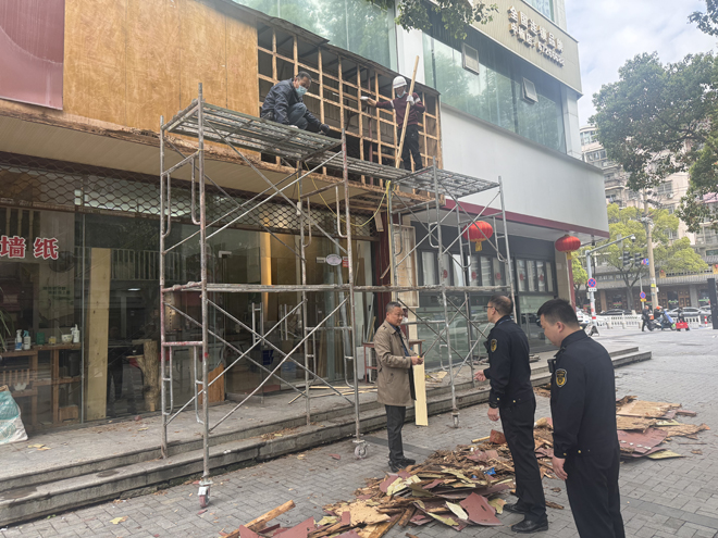 “你们快把店外的木板挪一挪,上面的钉子太危险了,万一扎到行人就不好了。”在王家坞路装修店前,执法队员正耐心劝导店主。现场可见,该店不仅存在占道经营行为,店铺装修后遗弃的木板随意堆放在人行道上,尖锐的钉子外露,不仅挤占了行人通行空间,更埋下安全隐患。不远处的浦西街,流动摊贩们摆在马路上,摊位挤占机动车道与非机动车道,不仅造成交通拥堵,也让过往行人通行不便。江楠大道周边,临时简易棚违规搭设,与周边整洁的市容环境格格不入,既影响通行秩序,也破坏了城市整体风貌。