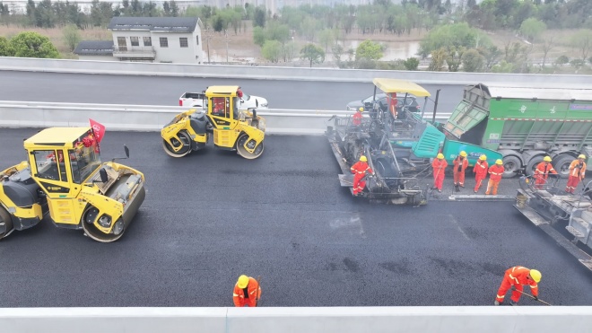 该工程施工现场机械轰鸣、一派繁忙景象。路面上,大型摊铺机缓缓前行,滚烫的沥青混合料被均匀铺开,数台压路机紧随其后反复碾压,施工人员在一旁细致检查路面平整度,及时修整边角,确保路面平整坚实。该项目总工程师郭申介绍,目前工程沥青摊铺工作已完成50%左右,待下面层摊铺全部结束后,计划于4月中旬启动上面层摊铺作业,预计6月底可完成全部上面层摊铺,届时项目将具备通车条件。