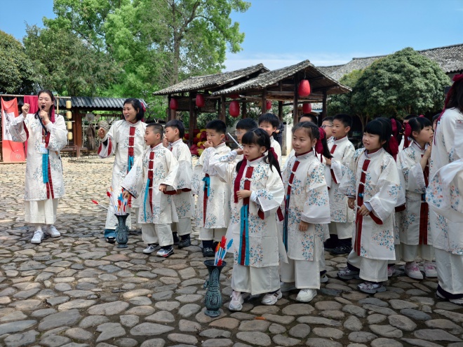上午9时许,伴随着整齐的步伐与清脆的欢声笑语,学生们有序抵达芙蓉古村。为让孩子们深度感受古村的文化底蕴与宋韵风采,研学活动精心设计了多样化体验环节。身着雅致宋服,学生们在导师的悉心指引下,躬身研习宋礼、趣味体验投壶,沉浸式感受宋代文人雅士的生活雅趣。