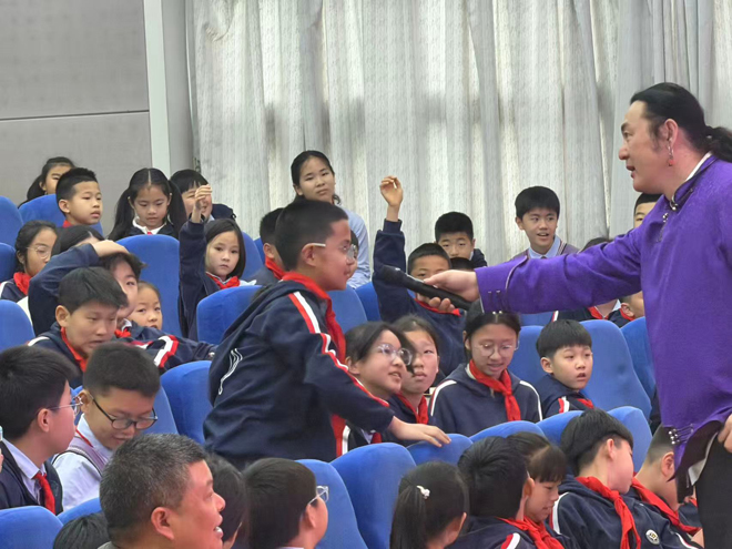 黑鹤是蒙古族著名自然文学作家、中国原生猛犬研究者,现任中国作家协会全委会委员、黑龙江省作家协会副主席。他4岁至8岁在呼伦贝尔草原上与外祖父生活,与蒙古牧羊犬为伴,和小狼、小鹿等动物共同成长,这段经历塑造了他的创作底色。讲座中,他以“作家的童年”为主线,结合口弦琴演奏和草原影像,生动分享了与蒙古牧羊犬相伴的童年故事,围绕“祖国”“草原生活”“动物伙伴”等话题,让孩子们仿佛置身辽阔草原。互动环节中,他分享写作经验,讲述自己因读《森林报》而后来获得“比安基国际文学奖”的圆梦故事,启发孩子们追寻梦想。