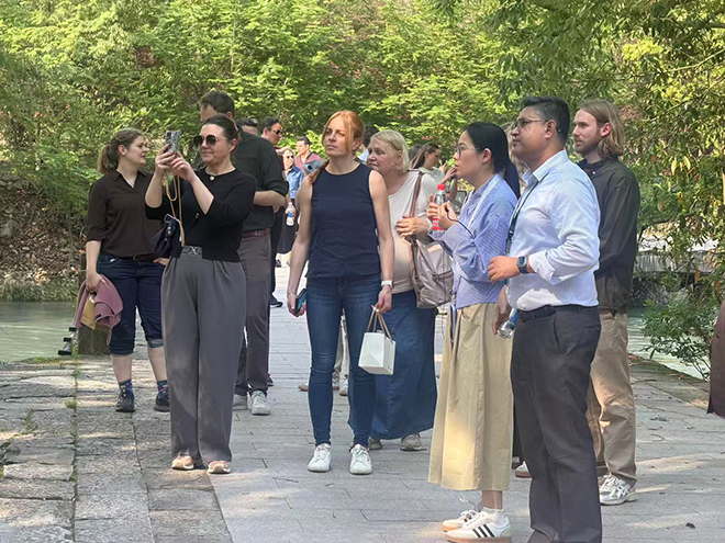 当天下午,代表团前往永嘉书院参观,感受永嘉自然风光与传统文化。成员们纷纷盛赞永嘉山水独具特色,朱利安·乌尔施莱格、乔安娜·霍瓦尔德、克里斯蒂安·施陶费尔表示,永嘉的青翠群山与瑞士风光截然不同,也与中国其他大城市不同,很喜欢这里的瀑布、花草和传统建筑,非常有中国味道,希望将来能带家人和朋友再来永嘉。
